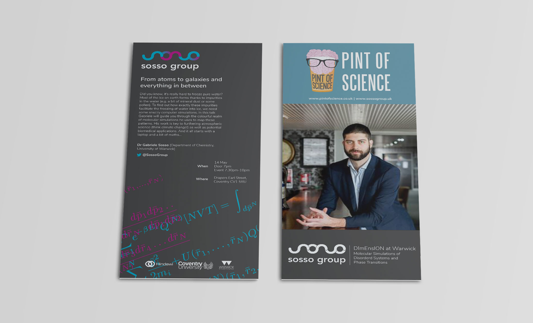 Visual identity for Sosso Group, a PhD research group directed by Dr. Gabriele C. Sosso, who serves as an Assistant Professor of Computational Chemistry at Warwick University.